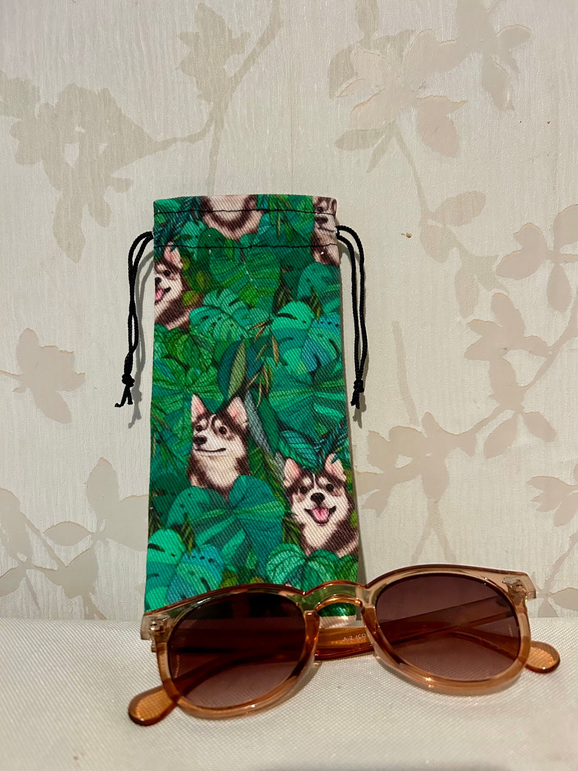 Kek hoesje van denim met hondenprint en gevoerd met een zachte stof.