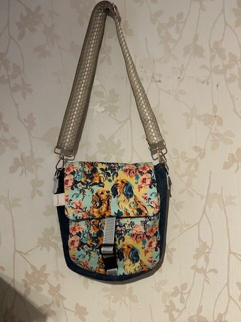 De afsluitbare voorflap is van denim met aan twee kanten het , en daarachter zit nog een vakje ook van denim ontwerp en aan de binnenkant vind je ook nog een zakje.